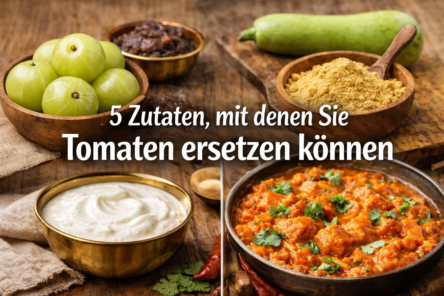 Die besten Alternativen zu Tomaten sind Mangopulver, Tamarinde, Amla, Flaschenkürbis und Joghurt. Sie ersetzen entweder die Säure, die Konsistenz oder den Geschmack der Tomate und eignen sich besonders für Currys, Saucen und Eintöpfe.