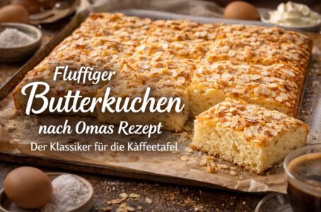 Wer sich also an einem sonnigen Nachmittag eine kleine Süßigkeit gönnen möchte oder auf der Suche nach einem Kuchen für eine Feier ist, sollte unbedingt einmal den Butterkuchen nach Omas Rezept ausprobieren. Mit seinem unvergleichlichen Geschmack und seiner einfachen Zubereitung wird er garantiert zum neuen Lieblingskuchen.