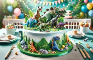 - Letzte Feinarbeiten: Nachdem die Dinosaurier auf der Torte platziert wurden, können weitere Dekorationselemente hinzugefügt werden, wie zum Beispiel essbare Pflanzen, Felsen oder ein „Happy Birthday“-Schild im Dinosaurier-Stil.