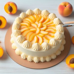 - Kuchen belegen: Verteilen Sie die Cremefine-Schmand-Pfirsich-Mischung gleichmäßig auf dem ausgekühlten Kuchenboden. Wenn Sie möchten, können Sie etwas Creme für die Dekoration aufheben und mit dem Spritzbeutel verteilen.