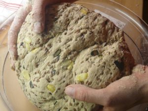 Über Nacht: Lassen Sie den Teig über Nacht im Kühlschrank auftauen oder etwa 12 Stunden lang in dem Plastikbeutel, in dem er verpackt ist. Nehmen Sie ihn aus dem Kühlschrank, nehmen Sie ihn aus dem Beutel, formen Sie ihn zu einer Kugel und legen Sie ihn in eine leicht geölte große Schüssel.