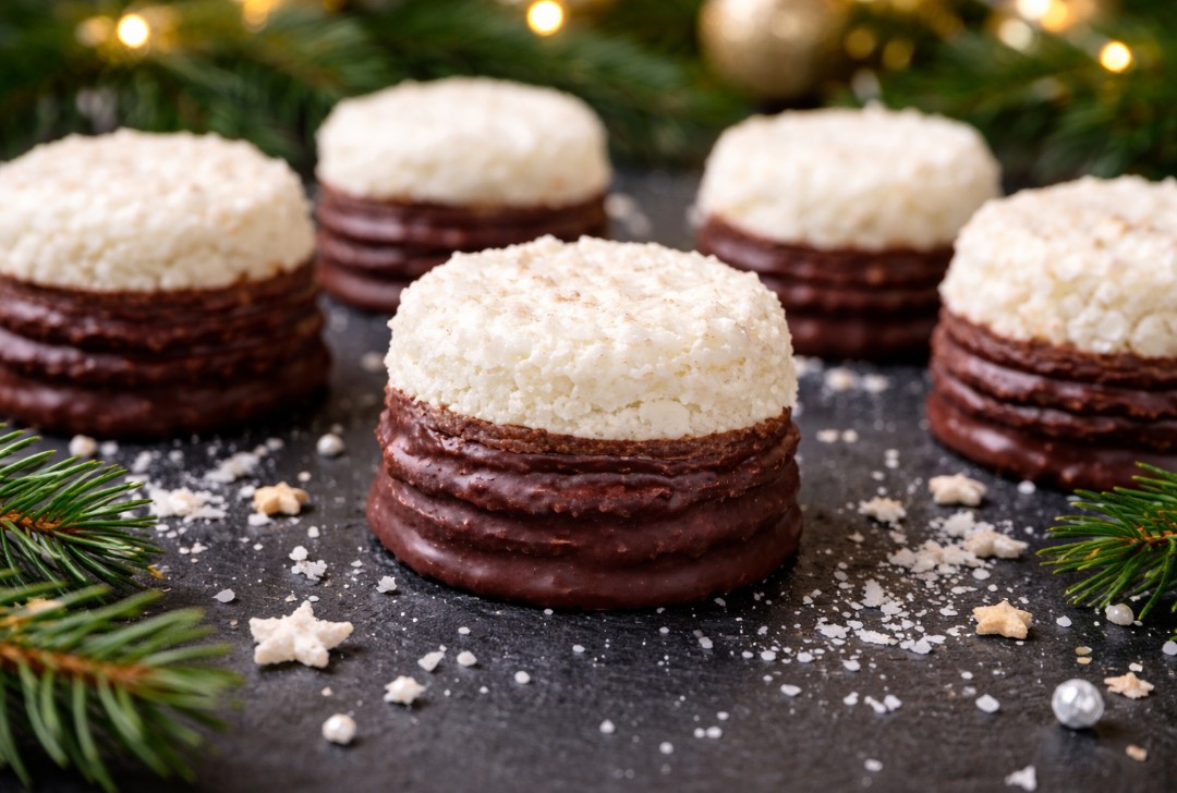 Kokoskuppeln sind sind kleine runde und flache Gebäckstücke, gefüllt mit einer weichen Schokocreme. Gebacken erhalten sie eine zarte goldene Farbe und eine knusprige Textur. Sie werden in eine glänzende Schokoladenglasur getaucht, so dass der untere Teil glänzend schokoladig aussieht. Abgerundet wird das Ganze mit einer Prise Kokosflocken.