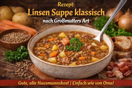 Linsen Suppe klassisch selber kochen mit diesem einfachen Rezept aus der Kategorie Suppen und Eintöpfe – herzhaft, sättigend und wunderbar bodenständig. Dieses Gericht erinnert an die gute alte Zeit, als einfache Zutaten mit Geduld und Liebe zu einem echten Wohlfühlessen wurden.