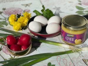 - Währenddessen 1 EL Ghee in einer antihaftbeschichteten Bratpfanne bei mäßiger Hitze erhitzen, bis es geschmolzen ist und leicht schäumt.