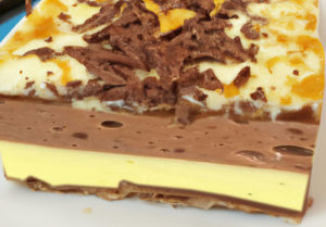 | 14. | Nachdem der Pudding Kuchen im Kühlschrank vollständig abgekühlt ist, geben wir die steif geschlagene Sahne darauf und streichen auch diese wieder glatt. |
