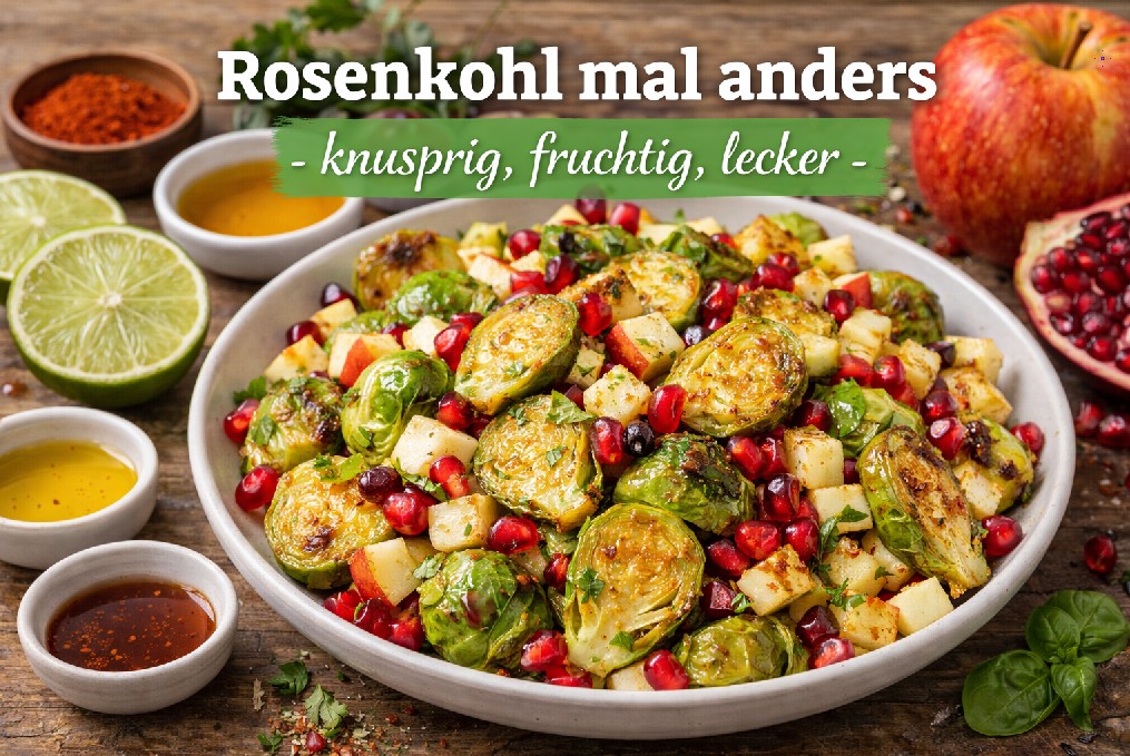 Rosenkohl hat einen sehr intensiven Eigengeschmack, der nicht jedermanns Sache ist. Wenn man allerdings ein paar Tricks und Kniffe bei der Zubereitung beherzigt, kann man auch so manchen Rosenkohl-Nörgler davon überzeugen, dass die kleinen Köpfchen einfach richtig lecker sein können. Hier wird der grüne kleine Kohl geröstet und begeistert neben Granatapfel und Apfel nicht nur geschmacklich, sondern auch optisch.