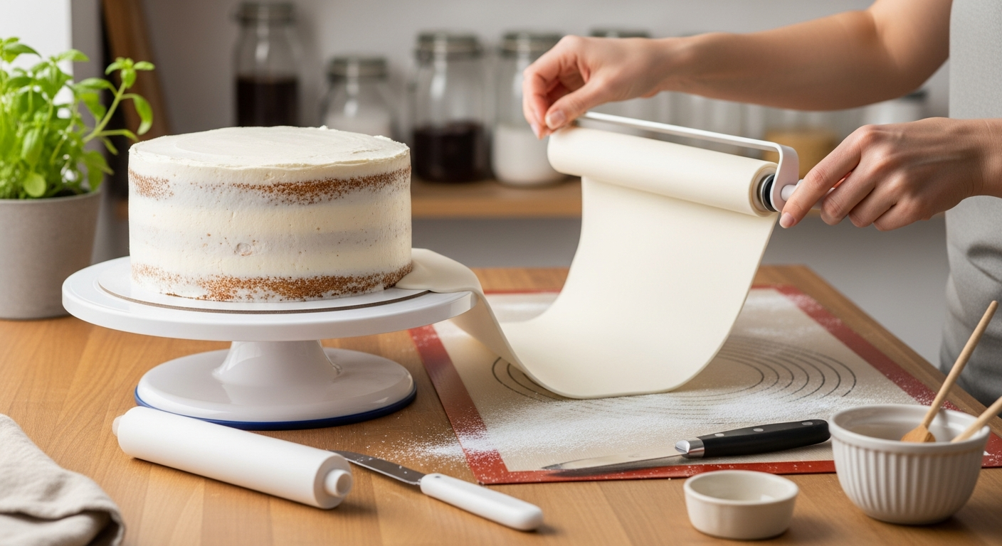 Jetzt kommt der spaßige Teil: das Eindecken der Tortemit Fondant. Dieser Teil mag einschüchternd erscheinen, aber der Trick besteht darin, die Werkzeuge die ganze Arbeit für Sie erledigen zu lassen. Stellen Sie sicher, dass Ihre Torte in der Nähe ist, bevor Sie beginnen.